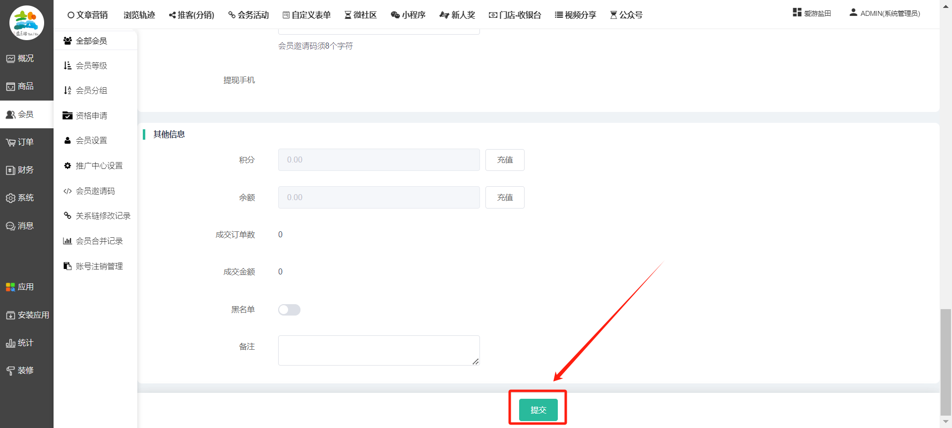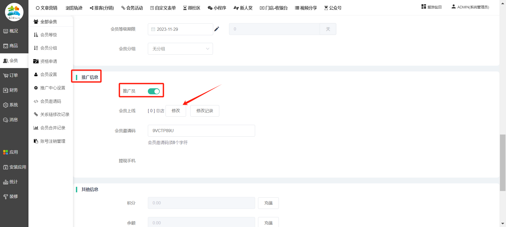 目录 搜索 展开 一、前期准备资料二、数字乡村码-上线操作指南1、服务号的申请流程及认证2、申请小程序流程3、开放平台绑定小程序和公众号三、数字乡村码-系统操作数字乡村码系统管理-概况数字乡村码-商品管理1、发布商品2、商品列表3、商品表单4、商品分类5、品牌管理6、配送模板7、评论管理8、优惠券管理9、商品标签10、退货地址设置11、满额优惠12、批量操作13、配送方式14、基础设置15、商品隐藏四、数字乡村码-会员管理1、全部会员2、会员等级3、会员分组4、资格申请5、会员设置6、推广中心设置7、会员邀请码8、会员关系链修改关系链修改记录9、会员合并记录10、账号注销管理11、会员设置中心五、数字乡村码-订单管理1、订单管理列表2、订单处理流程3、订单状态4、订单修改价格5、订单退款退货6、多包裹发货7、批量发货订单操作步骤8、催发货订单9、物流查询六、数字乡村码-财务管理1、余额设置2、会员余额3、充值记录4、转让记录5、余额明细6、收入明细7、提现设置8、提现统计9、积分管理10、转账审核11、收益广告12、批量充值七、数字乡村码-系统管理1、商城入口2、商城设置①、商城设置②、订单设置③、物流查询④、短信⑤、联系方式⑥、分类⑦、优惠券⑧、分享⑨、幻灯片⑩、广告位⑫、地图设置3、交易设置4、微信模板消息自定义消息模板(新版)自定义消息模板(旧版)小程序消息模板公众号模板消息变更公告5、语言设置6、权限管理7、多媒体管理八、数字乡村码-消息管理九、数字乡村码-应用管理十、数字乡村码系统-数据统计十一、数字乡村码-页面装修DIY1、模板管理2、店铺页面3、顶部导航4、底部导航5、DIY模板市场6、首屏广告7、基础设置8、装修DIY尺寸建议十二、供应商功能插件操作指南1、供应商2、门店-收银台门店申请和使用步骤门店管理①、门店-收银台 营销设置②、门店-收银台 分润设置门店分类门店申请门店审核门店商品门店商品订单收银台订单数据统计核销员基础设置默认设置门店装修3、微社区4、会务活动十三、营销插件操作指南活动报名提货卡新人奖微店问卷调查积分视频分享1、视频分享基础设置2、视频分享发现管理3、视频分享分类管理4、视频分享评论管理5、视频分享分红记录6、视频分享短视频中心每日红包幸运大抽奖签到优惠券二维码任务奖励优惠劵文章音频文章付费文章限时购新海报拓客卡操作流程积分活动素材中心视频红包十四、入驻门店应用类1、门店预约2、附近商品3、门店定位设置4、门店控制5、门店满额包邮6、门店满额减7、导入商品8、门店搜索9、门店股东10、核销券11、多门店核销1、商城后台设置2、前端功能演示十五、常见问题1、后台登录密码修改流程2、会员-余额,积分,后台如何进行充值与扣除3、如何修改上下级关系4、一种万能的获取商城小程序路径的方法 暂无相关搜索结果! 阅读次数:1608 本文档使用 模王系统 发布 8、会员关系链修改 8、会员关系链修改一.如何修改上下级关系?1.会员-全部会员-可以通过搜索用户的独立ID,或者用户微信昵称,找到此会员,然后点击右边的(操作)2.再点击会员详情。3.滑到下面,有个推广信息-会员上线,点击修改4.输入上级的ID号,点击搜索,出来此上级会员后点击选择。5.滑到最下面,一定要点击提交按钮。文档更新时间: 2023-11-30 14:56 作者:链上旅行