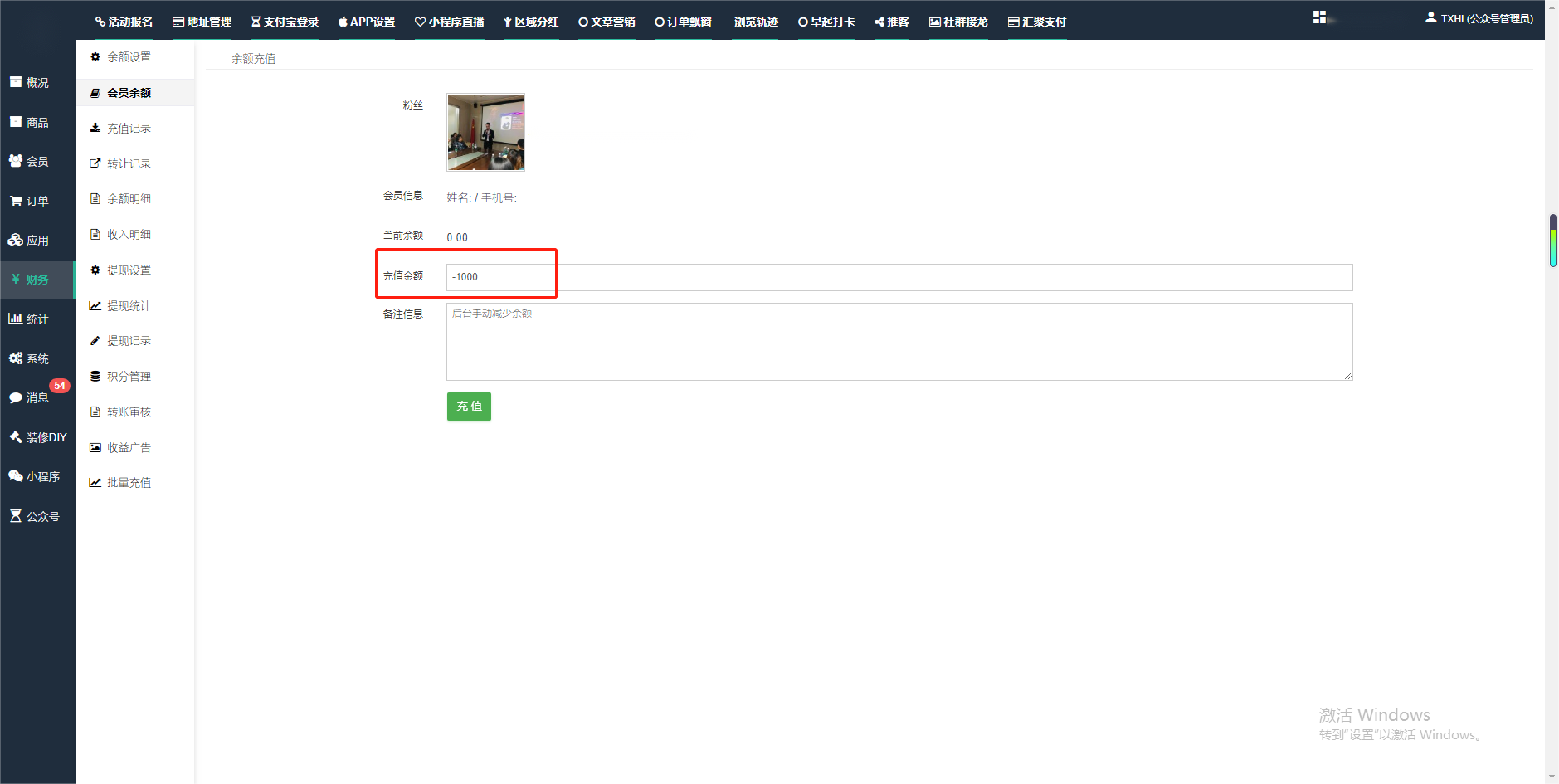 目录 搜索 展开 一、前期准备资料二、数字乡村码-上线操作指南1、服务号的申请流程及认证2、申请小程序流程3、开放平台绑定小程序和公众号三、数字乡村码-系统操作数字乡村码系统管理-概况数字乡村码-商品管理1、发布商品2、商品列表3、商品表单4、商品分类5、品牌管理6、配送模板7、评论管理8、优惠券管理9、商品标签10、退货地址设置11、满额优惠12、批量操作13、配送方式14、基础设置15、商品隐藏四、数字乡村码-会员管理1、全部会员2、会员等级3、会员分组4、资格申请5、会员设置6、推广中心设置7、会员邀请码8、会员关系链修改关系链修改记录9、会员合并记录10、账号注销管理11、会员设置中心五、数字乡村码-订单管理1、订单管理列表2、订单处理流程3、订单状态4、订单修改价格5、订单退款退货6、多包裹发货7、批量发货订单操作步骤8、催发货订单9、物流查询六、数字乡村码-财务管理1、余额设置2、会员余额3、充值记录4、转让记录5、余额明细6、收入明细7、提现设置8、提现统计9、积分管理10、转账审核11、收益广告12、批量充值七、数字乡村码-系统管理1、商城入口2、商城设置①、商城设置②、订单设置③、物流查询④、短信⑤、联系方式⑥、分类⑦、优惠券⑧、分享⑨、幻灯片⑩、广告位⑫、地图设置3、交易设置4、微信模板消息自定义消息模板(新版)自定义消息模板(旧版)小程序消息模板公众号模板消息变更公告5、语言设置6、权限管理7、多媒体管理八、数字乡村码-消息管理九、数字乡村码-应用管理十、数字乡村码系统-数据统计十一、数字乡村码-页面装修DIY1、模板管理2、店铺页面3、顶部导航4、底部导航5、DIY模板市场6、首屏广告7、基础设置8、装修DIY尺寸建议十二、供应商功能插件操作指南1、供应商2、门店-收银台门店申请和使用步骤门店管理①、门店-收银台 营销设置②、门店-收银台 分润设置门店分类门店申请门店审核门店商品门店商品订单收银台订单数据统计核销员基础设置默认设置门店装修3、微社区4、会务活动十三、营销插件操作指南活动报名提货卡新人奖微店问卷调查积分视频分享1、视频分享基础设置2、视频分享发现管理3、视频分享分类管理4、视频分享评论管理5、视频分享分红记录6、视频分享短视频中心每日红包幸运大抽奖签到优惠券二维码任务奖励优惠劵文章音频文章付费文章限时购新海报拓客卡操作流程积分活动素材中心视频红包十四、入驻门店应用类1、门店预约2、附近商品3、门店定位设置4、门店控制5、门店满额包邮6、门店满额减7、导入商品8、门店搜索9、门店股东10、核销券11、多门店核销1、商城后台设置2、前端功能演示十五、常见问题1、后台登录密码修改流程2、会员-余额,积分,后台如何进行充值与扣除3、如何修改上下级关系4、一种万能的获取商城小程序路径的方法 暂无相关搜索结果! 阅读次数:1613 本文档使用 模王系统 发布 2、会员-余额,积分,后台如何进行充值与扣除 会员-余额,积分,后台如何进行充值与扣除一.如何进行余额充值-扣除1.财务-会员余额-搜索会员昵称-右边点击充值余额2.扣除余额,只需要在充值金额前加上 - 号;比如充值-100,等于扣除100余额二,如何手动充值积分-扣除积分(充值与扣除逻辑跟余额是一样的)文档更新时间: 2024-01-05 14:28 作者:链上旅行