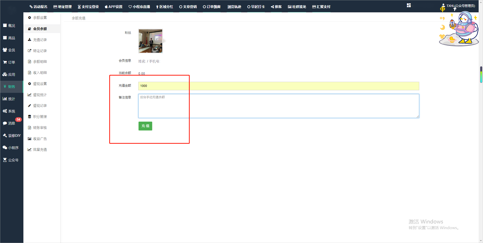 会员-余额,积分,后台如何进行充值与扣除一.如何进行余额充值-扣除1.财务-会员余额-搜索会员昵称-右边点击充值余额2.扣除余额,只需要在充值金额前加上 - 号;比如充值-100,等于扣除100余额二,如何手动充值积分-扣除积分(充值与扣除逻辑跟余额是一样的)文档更新时间: 2024-01-05 14:28 作者:链上旅行